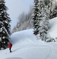 Cilj včerajšnjega pohoda na smučeh in krpljah iz doline Bele je bila Perkova kočica. Stoji na sedlu pod Pavličevimi stenami, ki ga domačini imenujejo Legar, in je na slovenski strani le kakšnih 15 m od državne meje z Avstrijo. Naprej od cestnega odcepa Legar/Lesnikovo sedlo je bila hoja naporna, ker sva si z Jožo utirala pot po vse globljem snegu. Na Legarju se je palica udrla za pol metra vse do tal. Do kočice sva hodila v megli, ob odhodu pa se je razkrajala in vidljivost je bila vse boljša, le visoke planine so se dolgo časa skrivale. Na delih ceste brez kolesnic se je dalo vijugati, v spodnjem delu poti pa sem si med njimi večkrat pomagal s pluženjem.