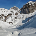 Snega je bilo od prejšnjega tedna skoraj pol manj. Osoje pa so komajda še dopustile prehod s planine v gozd. Sneg je bil komajda pomrznjen, a prijeten za hojo. Po grapi pod planino Krstenica se je skorja rahlo predirala. Od planine dalje sva drsela po trdem srencu, ki bi držal tudi pešaka. Zaradi varnosti pri prečenju pod Stogom sva nadela srenače. V dolini pod Škednjevcem naju je sonce pomladansko pregrevalo in mehčalo gornji del snežne odeje. Kože so dobro grabile vse do vrha. Mestoma v osojah sva naletela na zapihan pršič, ki naju je "obogatil" s coklami, a ne uznanovoljil. Končno je na vrhu malo zapihalo. Iz vrha Kanjavca sta vijugala dva smučarje iz Velske doline so se prikazali trije. Smuka navzdol....do 10 cm odtajanega srenca...Dolino je napolnilo vriskanje. Na Krstenici sva jo ubrala višje do razglednika in se prepustila soncu.