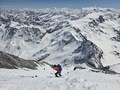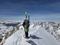 Zjutraj v svežem in sončnem jutru start proti vrhu. Žiga in Flip sta splezala po JZ grapi, z Ladotom pa sva pristopila po po normalki -V pobočju. Pofotkali smo lepe razglede iz vrha, nato priprava na spust. Odsmučali ( prebili ) smo se po že zelo slabo narejenem vršnem grebenu do rame, nato pa spust v vzhodno pobočje. Tukaj je bila smuka odlična vse do vstopa v kuloar, kjer se zadeva zoži na širino smuči- ne gre brez bočnega drsenja. Sledilo je še res uživaško vijuganje do koče , kjer smo nadaljevali z martinčaknjem in hidracijo.